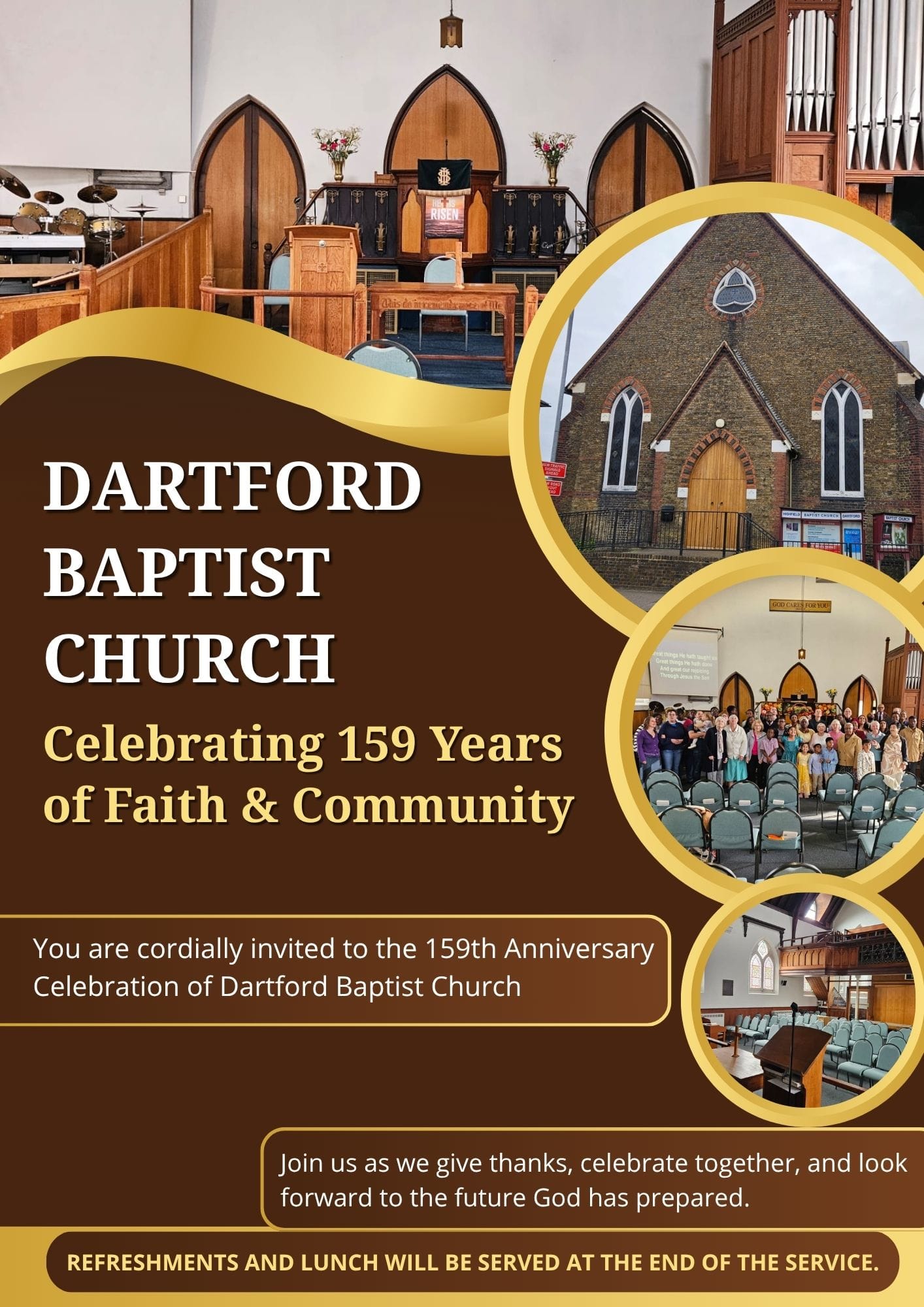 After the service, we offer complimentary tea, coffee, and biscuits. This is an excellent opportunity to meet others and get to know the community.